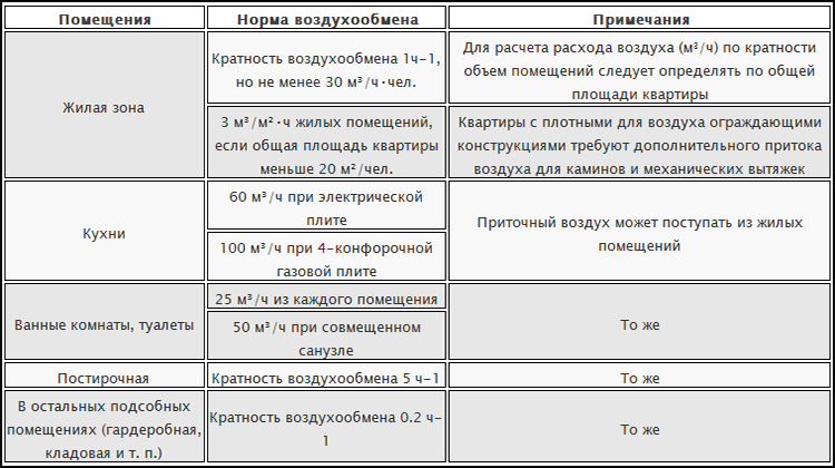 Для упрощения определения нужного воздухообмена в жилом доме можно воспользоваться специально принятыми для этого нормами минимального воздухообмена в жилых помещениях: